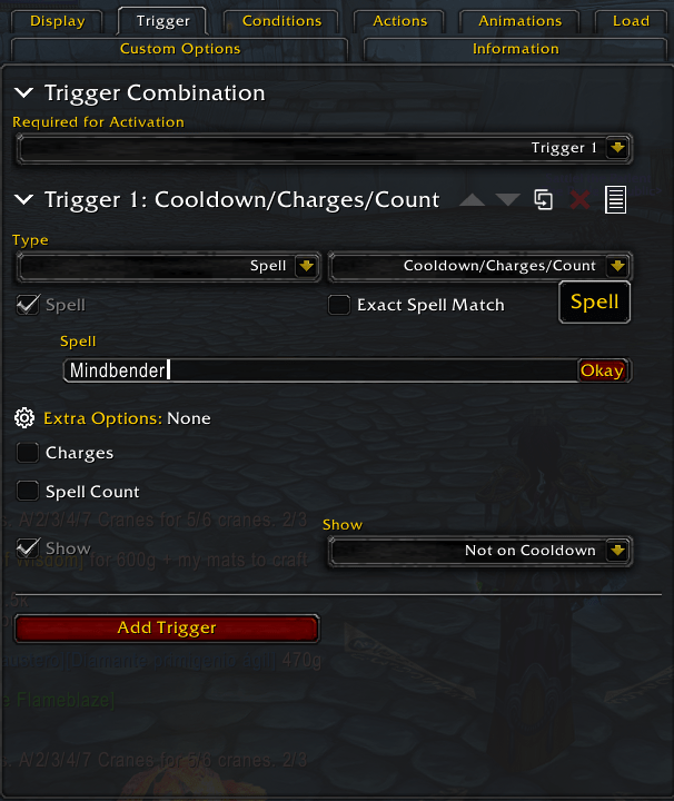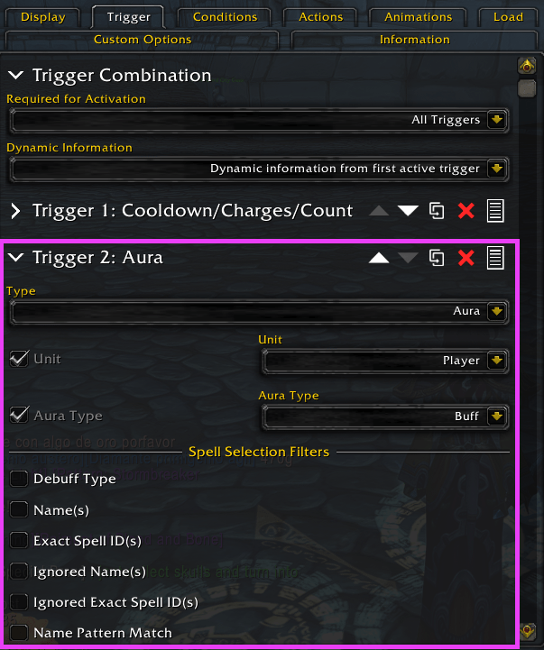 It says “Trigger 1: Aura“. That means it is in Aura mode right now. Aura is another word for buffs. That’s wrong, I don’t want it to look at Auras (buffs). I want it to look at my spell.