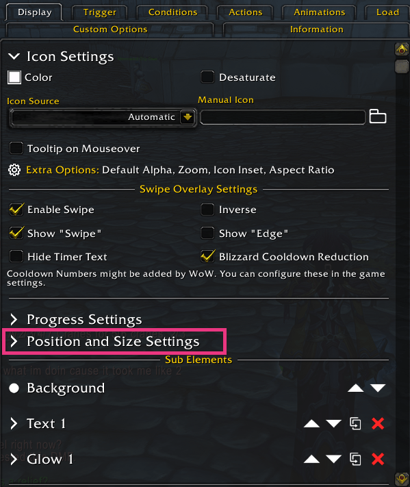 I could mess with the other settings below that, to move the WeakAura icon around on my screen…