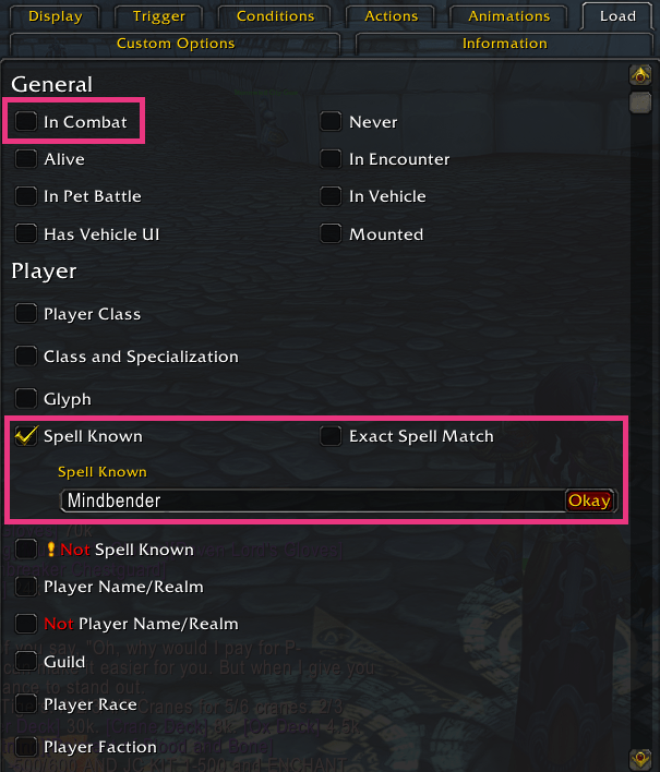 All we have to do is check the box for “In Combat” at the top, and check the box for “Spell Known” below, and type in “Mindbender”: